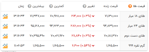 هر گرم طلای 18 عیار نیز با افت 21 هزار و 400 تومانی قیمت، 7 میلیون و 113 هزار تومان در طلافروشی ها خرید و فروش می شود.