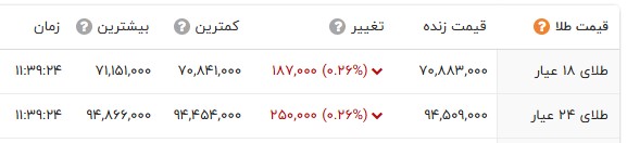 در بازار نرخ هر گرم طلای 18 عیار با 18 هزار تومان کاهش و با نرخ هفت میلیون و 88 هزار تومان در بازار طلا معامله شد. سکه امامی با 10 هزار تومان افزایش به 79 میلیون و 495 هزار تومان قیمت گذاری شد. سکه بهار آزادی با 20 هزار تومان افزایش به 71 میلیون و 810 هزار تومان رسید. نرخ نیم سکه و ربع سکه به ترتیب 42 میلیون و 500 هزار تومان و 24 میلیون و 700 هزار تومان در تابلو اعلان قیمتها نمایان شد.