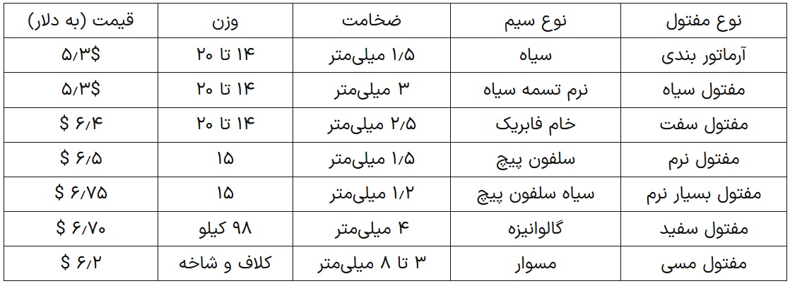 اما از آنجایی که جنس مفتول یکی از مهمترین موارد، قبل از خرید و متناسب با نوع پروژه (حتی بدون در نظر گرفتن قیمت) انتخاب میشود. شاید اطلاع از بازه قیمتی سیم مفتولی قبل از خرید برای شما از اهمیت بالایی برخودار باشد:
