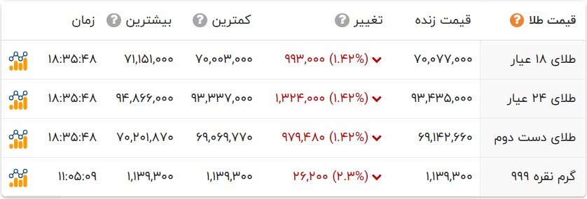 در بازار نرخ هر گرم طلای 18 عیار با 99 هزار تومان کاهش و با نرخ هفت میلیون و 7 هزار تومان در بازار طلا معامله شد. سکه امامی با یک میلیون و 620 هزار تومان کاهش به 78 میلیون و 40 هزار تومان قیمت گذاری شد. سکه بهار آزادی با 900 هزار تومان کاهش به 70 میلیون و 990 هزار تومان رسید. نرخ نیم سکه و ربع سکه به ترتیب 41 میلیون و 860 هزار تومان و 24 میلیون و 560 هزار تومان در تابلو اعلان قیمتها نمایان شد.