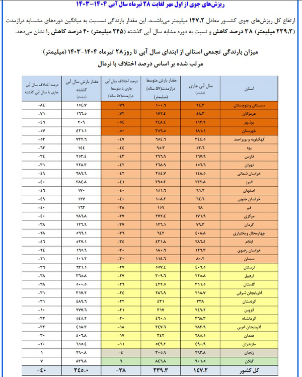 ارتفاع کل ریزشهای جوی کشور از اول سال آبی از مهر پارسال تا کنون معادل 147.2 میلیمتر است که این مقدار بارندگی نسبت به میانگین دورههای مشابه دراز مدت (239.3 میلی متر) حدود 38 درصد کاهش و نسبت به دوره مشابه سال آبی قبل (245 میلی متر) 40 درصد کاهش را نشان میدهد.