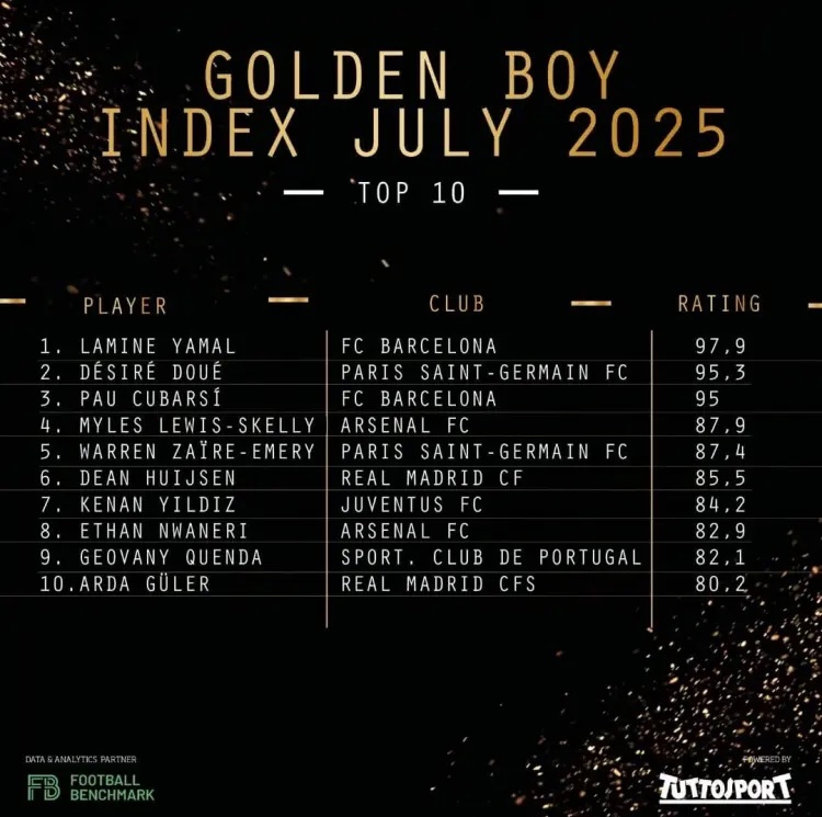 اینها ۱۰ بازیکن برتر در شاخص "GBFB" هستند. یامال، دوئه و کوبارسی همچنان در شاخص تعیین برنده پسر طلایی، که بر اساس عملکرد بازیکنان بین ۷ اکتبر ۲۰۲۴ تا ۱۳ جولای ۲۰۲۵ ارزیابی میشود، پیشتاز هستند. مایلز لوئیس-اسکلی (آرسنال) و زایر امری پنج جایگاه برتر را تکمیل میکنند.