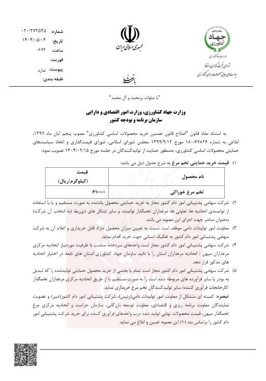 در بخشی از این نامه آمده است که به استناد مفاد قانون اصلاح قانون تضمین خرید محصولات اساسی کشاورزی مصوب ابلاغی مجلس شورای اسلامی، شورای قیمت گذاری و اتخاذ سیاستهای حمایتی محصولات اساسی کشاورزی به منظور حمایت از تولید کنندگان، نرخ مصوب خرید حمایتی تخم مرغ 61 هزار تومان اعلام شد.