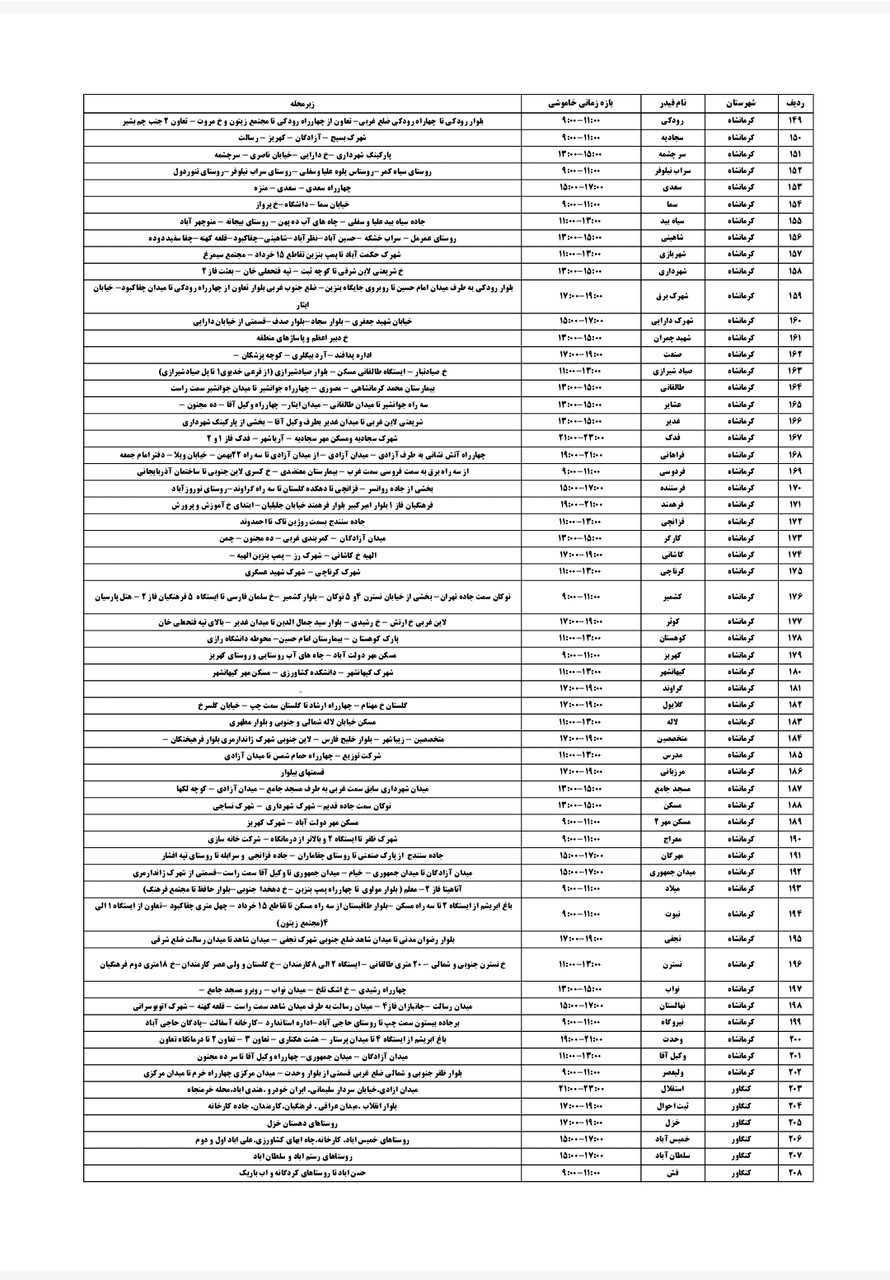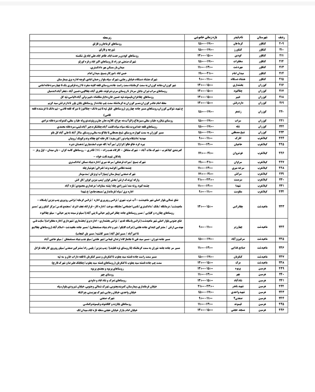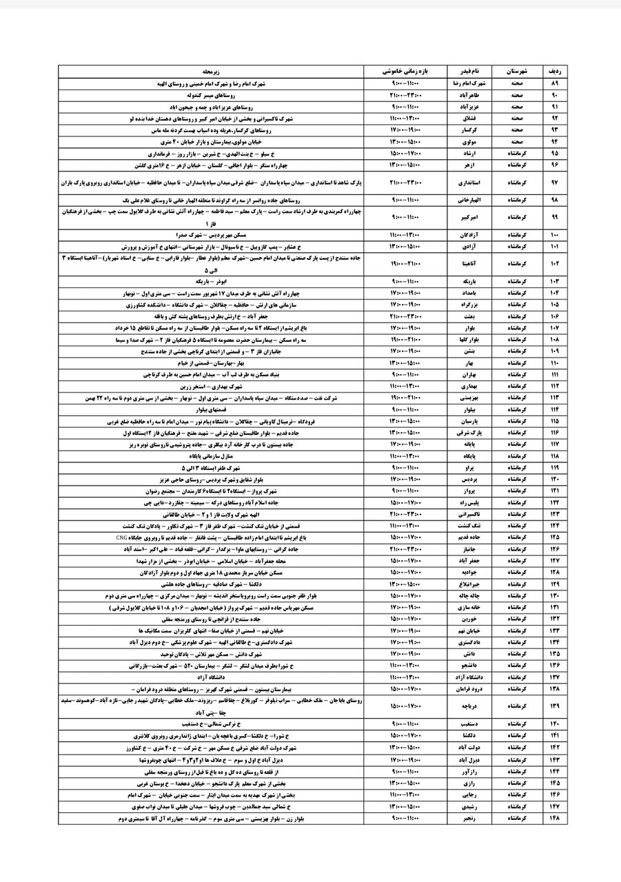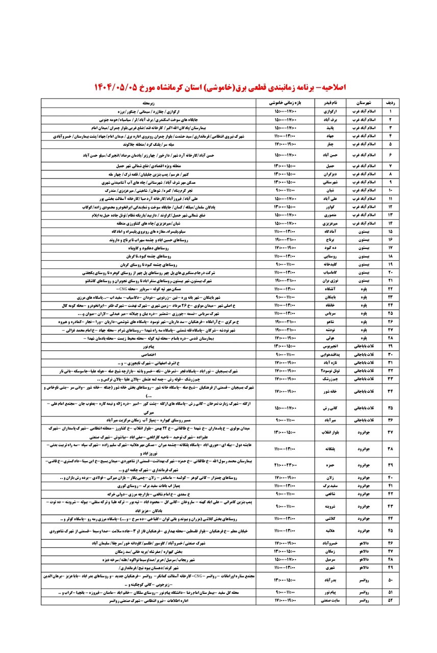 شرکت توزیع برق استان کرمانشاه طی جدولی، زمانبندی قطعی برق در مناطق مختلف استان کرمانشاه را برای _یکشنبه پنجم مرداد_ اعلام کرد.