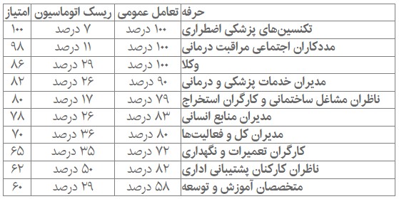 تکنسینهای فوریتهای پزشکی و مددکاران اجتماعی مراقبتهای درمانی، با ۱۰۰ درصد تعامل عمومی و ریسک بسیار پایین اتوماسیون در صدر فهرست قرار دارند. این مشاغل نیاز به تصمیمگیریهای فوری، هوش هیجانی و پاسخگویی در لحظه دارند؛ ویژگیهایی که هوش مصنوعی هنوز برای رسیدن به آنها تلاش میکند.