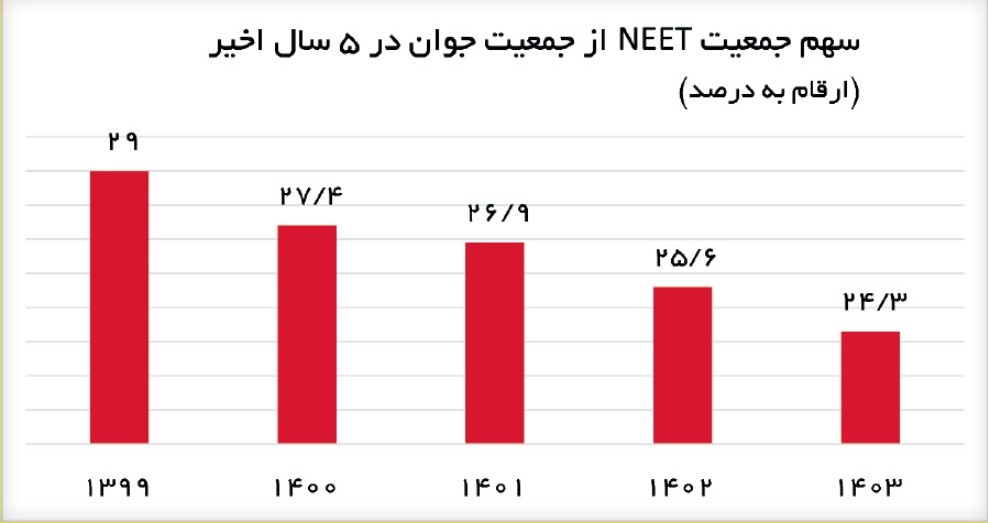 طبق آخرین داده های منتشرشده از سوی مرکز آمار ایران، نرخ «نیت» (NEET) که نشاندهنده سهم جوانان ۱۵ تا ۲۴ سالهای است که نه در حال تحصیلاند، نه شاغلاند و نه در حال کسب مهارت، در سال ۱۴۰۳ به ۲۴.۳ درصد رسیده است. هرچند این رقم نسبت به سال ۱۳۹۹ که در اوج خود و معادل ۲۹ درصد بود، کاهش یافته، اما همچنان بهصورت معناداری بالاست؛ بهویژه در مقایسه با کشورهایی که برای پایداری منابع انسانی خود سیاستهای فعال آموزش و اشتغال را دنبال میکنند. میانگین جهانی نرخ نیت ها در دنیا در حدود ۲۰ درصد است.