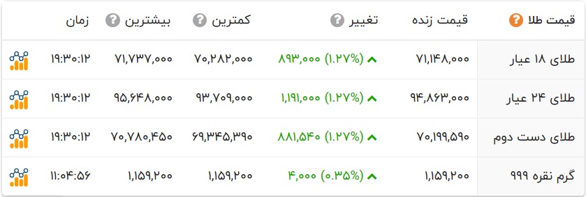 در بازار نرخ هر گرم طلای 18 عیار با 89 هزار تومان افزایش و با نرخ هفت میلیون و 114 هزار تومان در بازار طلا معامله شد. سکه امامی با یک میلیون و 220 هزار تومان افزایش به 79 میلیون و 850 هزار تومان قیمت گذاری شد. سکه بهار آزادی با یک میلیون و 200 هزار تومان افزایش به 72 میلیون و 190 هزار تومان رسید. نرخ نیم سکه و ربع سکه به ترتیب 42 میلیون و 660 هزار تومان و 25 میلیون و 160 هزار تومان در تابلو اعلان قیمتها نمایان شد.