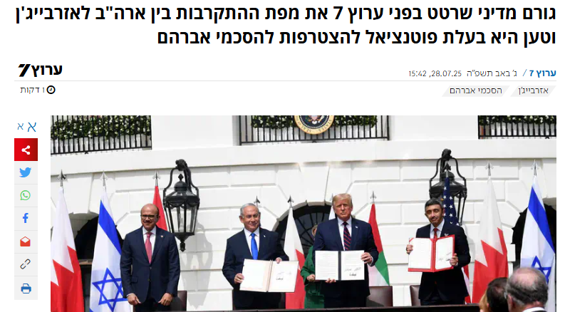 به گزارش شبکه هفت تلویزیون رژیم صهیونیستی، یک منبع نزدیک به جریان سیاسی در گفتوگو شبکه با این بعد از ترسیم نقشه روند نزدیکی میان ایالات متحده و آذربایجان، مدعی شد آذربایجان ظرفیت عضویت در پیمان ابراهیم را دارد.