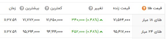در بازار نرخ هر گرم طلای 18 عیار با 34 هزار تومان افزایش و با نرخ هفت میلیون و 156 هزار تومان در بازار طلا معامله شد. سکه امامی با 90 هزار تومان کاهش به 79 میلیون و 605 هزار تومان قیمت گذاری شد. سکه بهار آزادی با 180 هزار تومان افزایش به 72 میلیون و 285 هزار تومان رسید. نرخ نیم سکه و ربع سکه به ترتیب 42 میلیون و 800 هزار تومان و 25 میلیون و 300 هزار تومان در تابلو اعلان قیمتها نمایان شد.