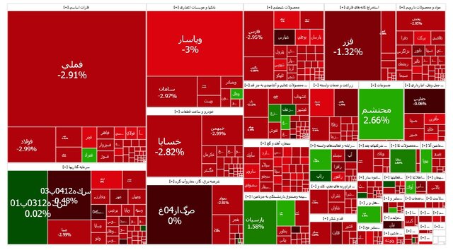 فارس، فملی و فولاد بیشترین تاثیر منفی را بر شاخص بورس داشتند. از نمادهای پرتراکنش نیز میتوان به خساپا، فملی و ولنوین اشاره کرد.