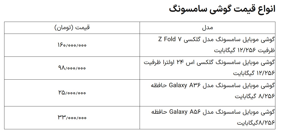 گوشی موبایل سامسونگ گلکسی اس 24 اولترا ظرفیت 12/256 گیگابایت در اواسط اردیبهشت جهش قیمتی را تجربه کرد و میانگین قیمتی آن به 100 میلیون تومان رسید. گوشی موبایل سامسونگ مدل Galaxy A36 حافظه 8/256 گیگابایت هم در اوایل اردیبهشت به میانگین قیمتی 31 میلیون تومان رسید اما پس از آن روند کاهش بها را پیش گرفت و در مرداد به پایینترین حد خود در سال 1404 رسید.