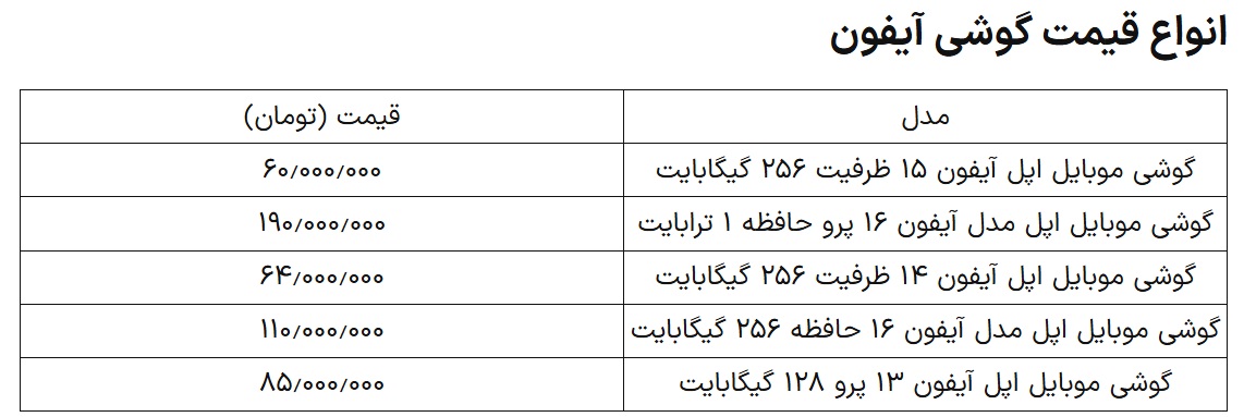 گوشی موبایل اپل آیفون 15 ظرفیت 256 گیگابایت در اواسط خرداد به بالاترین حد خود رسید و با میانگین قیمتی 75 میلیون تومان معامله میشد، در اواخر تیر قیمت آن پایینتر آمد و به میانگین 50 میلیون تومان رسید و پس از آن دوباره روند قیمتی آن شدت گرفت و به 60 میلیون تومان رسید.