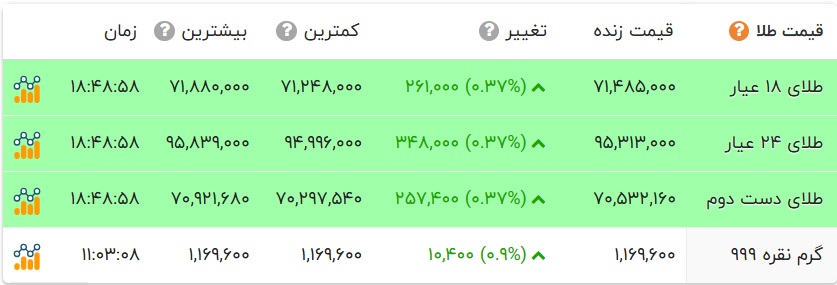 در بازار نرخ هر گرم طلای 18 عیار با 26 هزار تومان افزایش و با نرخ هفت میلیون و 148 هزار تومان در بازار طلا معامله شد. سکه امامی با 510 هزار تومان کاهش به 79 میلیون و 350 هزار تومان قیمت گذاری شد. سکه بهار آزادی با 100 هزار تومان افزایش به 72 میلیون و 310 هزار تومان رسید. نرخ نیم سکه و ربع سکه به ترتیب 42 میلیون و 560 هزار تومان و 24 میلیون و 960 هزار تومان در تابلو اعلان قیمتها نمایان شد.