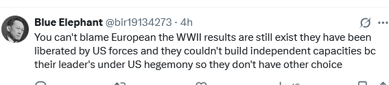 شما نمیتوانید اروپاییها را سرزنش کنید، اثرات جنگ جهانی دوم هنوز وجود دارد، آنها توسط نیروهای آمریکایی آزاد شدهاند و به دلیل رهبرشان که تحت هژمونی ایالات متحده بود، نتوانسته اند ظرفیتهای مستقلی را، ایجاد کنند. بنابراین چاره دیگری نداشتند.