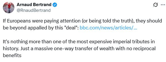 فون در لاین شکست خورد 🙈 آمریکا میخندد، اتحادیه اروپا هزینه میدهد! اختلاف تعرفهای باخت، میلیاردها دلار ضرر. در حالی که صنعت ما (اروپا) در حال آسیب دیدن است، فون در لاین تسلیم واشنگتن شد. هر کسی که اروپا را اینگونه "رهبری" کند، باید آن را واگذار کند. فون در لاین باید به جای دوره دوم، استعفا دهد!اگر اروپاییها متوجه بودند (یا حقیقت را به آنها میگفتند)، باید از این «معامله» وحشتزده میشدند: این چیزی جز یکی از گرانترین خراجهای امپراتوری در تاریخ نیست. فقط یک انتقال عظیم یکطرفه ثروت بدون هیچ مزیت متقابلی