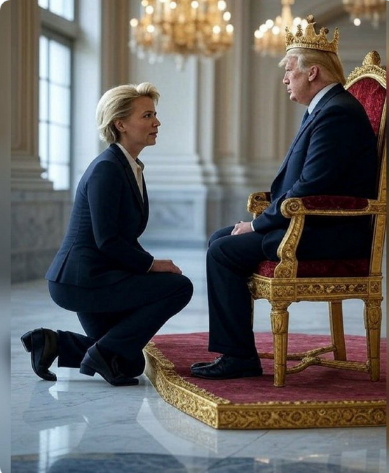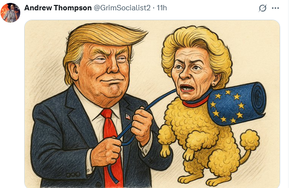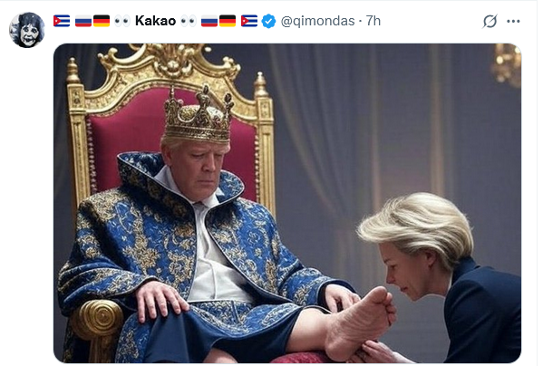 کاربران فضای مجازی با انتشار کاریکاتورهایی از رئیس کمیسیون اروپا اورسولا فون درلاین و ترامپ توافق تجاری روز گذشته میان آمریکا و اتحادیه اروپا را زیر سوال بردند.