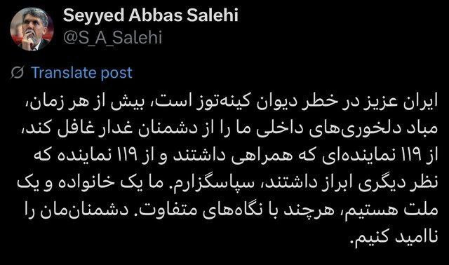 سیدعباس صالحی در این پیام آورده است: «ایران عزیز در خطر دیوان کینهتوز است، بیش از هر زمان، مباد دلخوریهای داخلی ما را از دشمنان غدار غافل کند.