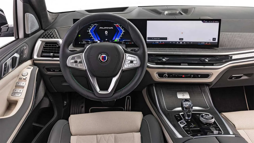 XB7 در ظاهر با رنگ سبز متالیک آلپینا، رینگهای 23 اینچی چند پره اختصاصی و کیت بدنه آلپینا شامل فلپ زیر سپر جلو، دیفیوزر عقب و اسپویلر، خود را از X7 معمولی متمایز میکند. کابین این XB7 نیز با چرم مرینو سفید عاجی و خاکستری اطلس تزئین شده است. تریم چوب گردوی XB7 زیباست اما شاید نیاز به پرداخت نهایی بهتری داشته باشد چون پارچه روی سطح آن گیر میکند. آلپینا مجهز به صفحه آمپر دیجیتالی 12.3 اینچی قابلتنظیم و صفحهنمایش لمسی 14.9 اینچی با کنترل حرکتی و پشتیبانی بیسیم اپل کارپلی و اندروید اتو است. هر دو نمایشگر خوانا و سریع عمل میکنند و در قاب خمیده خود زیبا هستند. هدآپ دیسپلی و پد شارژ بیسیم بهصورت استاندارد وجود دارد و گرمکن زیر آرنجیها (علاوه بر صندلی و فرمان گرم)، تهویه و ماساژور صندلیهای جلو، درهای خودکار سافت کلوز و گرمکن و سردکن جا لیوانیهای کنسول مرکزی هم ازجملهٔ آپشنهای لوکس هستند.