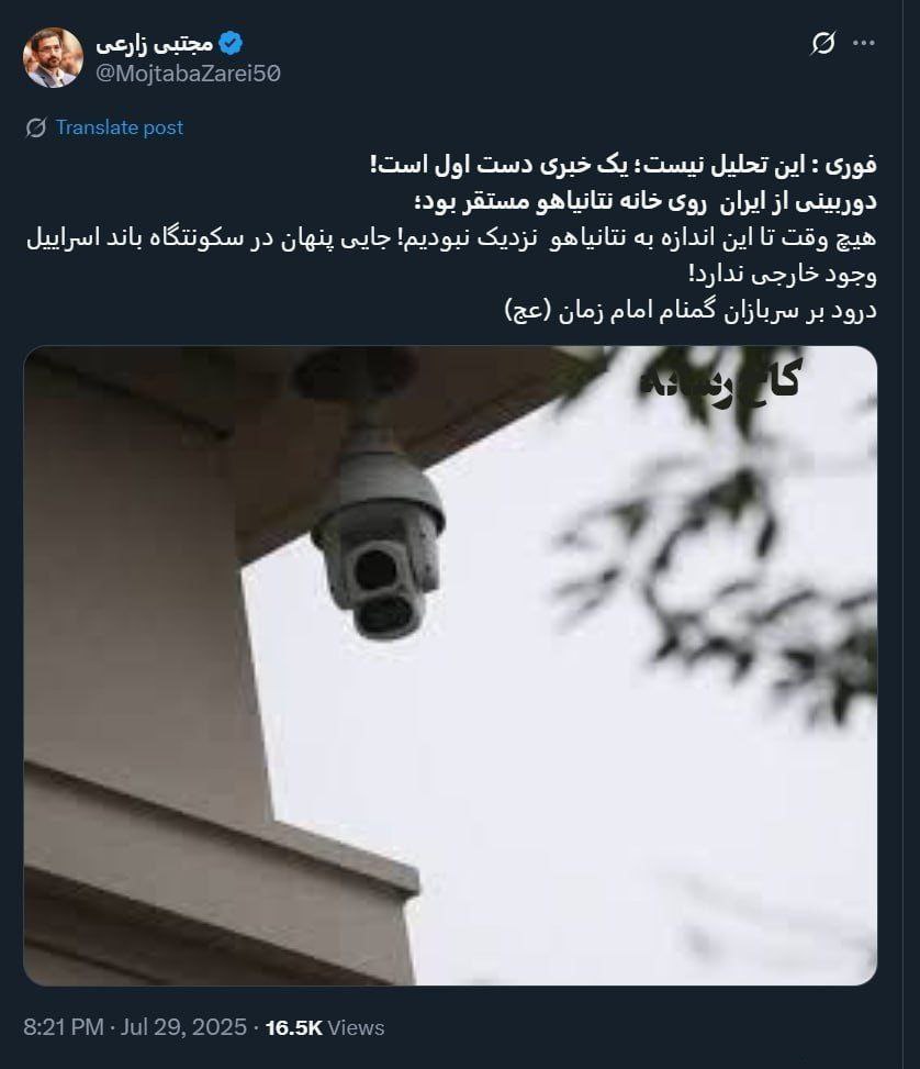 مجتبی زارعی، نماینده مردم تهران در مجلس شورای اسلامی، شامگاه گذشته با انتشار توییتی در شبکه اجتماعی «ایکس» نوشت: فوری: این تحلیل نیست؛ یک خبری دست اول است! دوربینی از ایران روی خانه نتانیاهو مستقر بود؛ هیچ وقت تا این اندازه به نتانیاهو نزدیک نبودیم! جایی پنهان در سکونتگاه باند اسرائیل وجود خارجی ندارد!