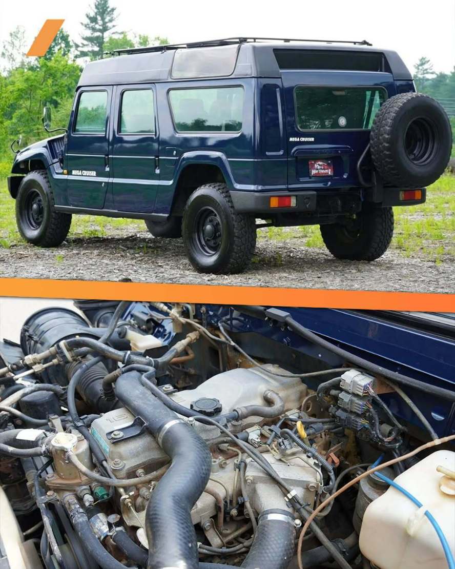 این خودرو ظرفیت نشستن 10 نفر را دارد و حتی فضای کافی برای ایستادن نیز فراهم میکند. از نظر فنی، مگا کروزر به موتور 4.1 لیتری چهار سیلندر توربودیزل مجهز است که 153 اسب بخار قدرت و 382 نیوتنمتر گشتاور تولید میکند. یک گیربکس 4 سرعته اتوماتیک و سه دیفرانسیل قفلشونده نیز از دیگر ویژگیهای فنی این غول آفرود هستند که تواناییهای فوقالعاده آن را در مسیرهای دشوار تضمین میکنند.