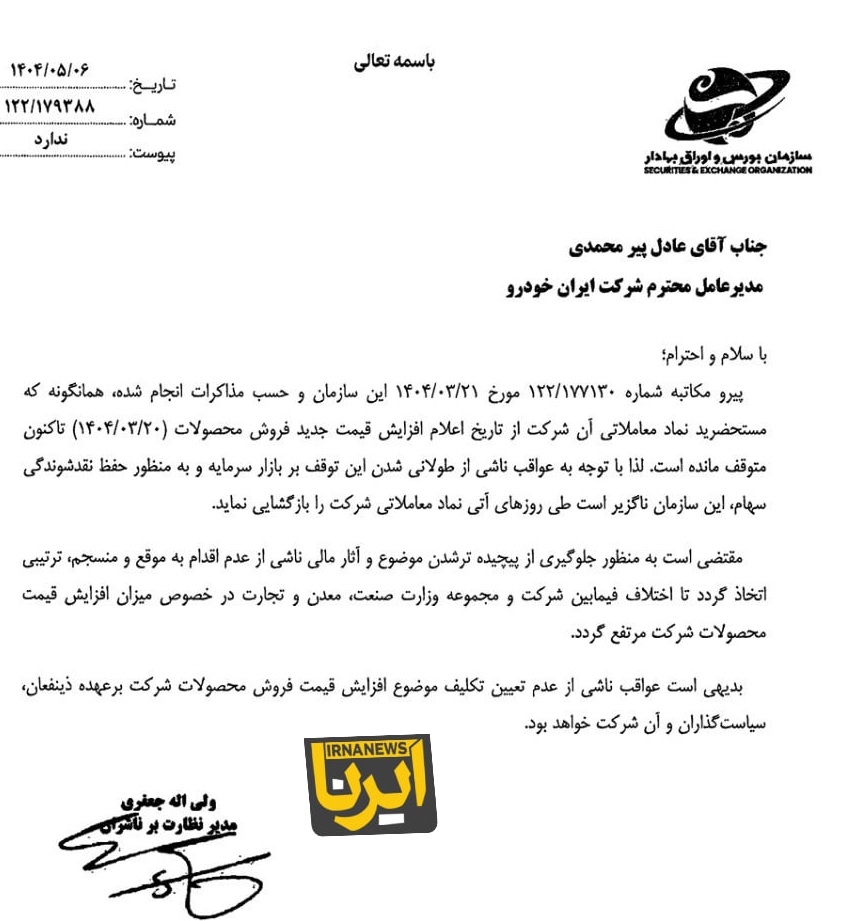 ولیالله جعفری مدیر نظارت بر ناشران سازمان بورس و اوراق بهادار دوشنبه ۶ مرداد ماه طی نامهای به مدیرعامل ایرانخودرو اعلام کرده بود که نماد این شرکت در بورس از ۲۰ خرداد و از تاریخ انتشار قیمتهای جدید محصولات ایرانخودرو در سامانه کدال تا این هفته متوقف بود.