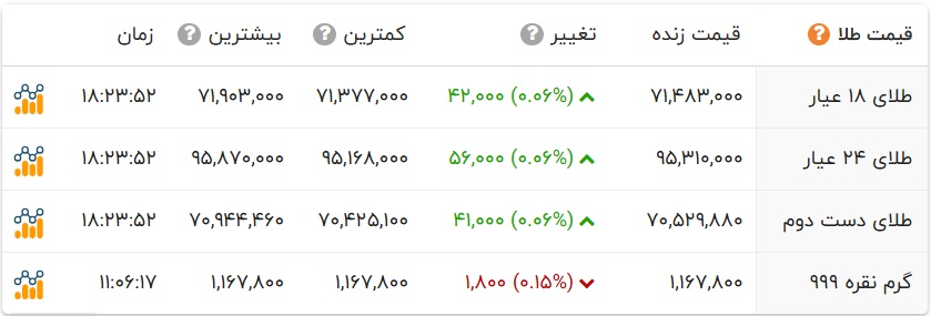 در بازار نرخ هر گرم طلای 18 عیار با 4 هزار تومان افزایش و با نرخ هفت میلیون و 148 هزار تومان در بازار طلا معامله شد. سکه امامی با 600 هزار تومان افزایش به 79 میلیون و 940 هزار تومان قیمت گذاری شد. سکه بهار آزادی با 90 هزار تومان افزایش به 72 میلیون و 390 هزار تومان رسید. نرخ نیم سکه و ربع سکه به ترتیب 42 میلیون و 860 هزار تومان و 24 میلیون و 960 هزار تومان در تابلو اعلان قیمتها نمایان شد.