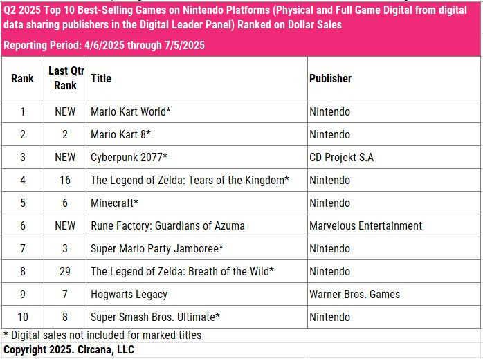در نهایت، آمار فروش بازیها در پلتفرم نینتندو را مشاهده میکنید که نکته قابل توجه آن، استقبال بازیکنان از پورت عنوان Cyberpunk 2077 است.