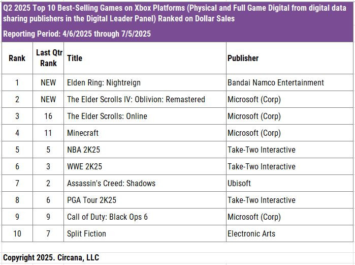 همانند پلتفرم پلی استیشن، در کنسولهای ایکس باکس نیز بهنظر میرسد این بازی Elden Ring Nightreign است که موفق کسب جایگاه پرفروشترین بازی بهار شده است. در رده دوم و سوم نیز بازی The Elder Scrolls IV :Oblivion و The Elder Scrolls Online قرار دارند.