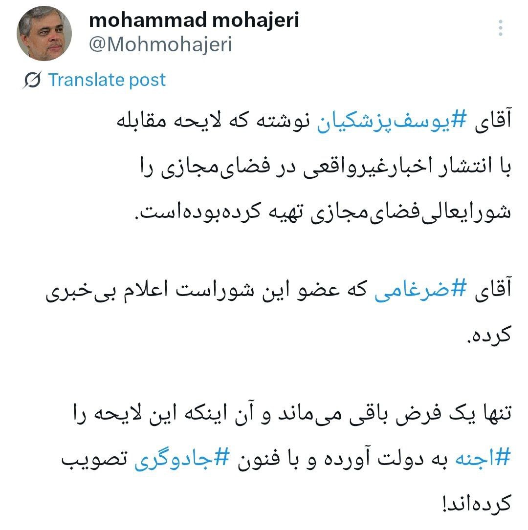کنایه محمد مهاجری به لایحه فضای مجازی: لایحه را اجنه به دولت آورده و با فنون جادوگری تصویب کردهاند!
