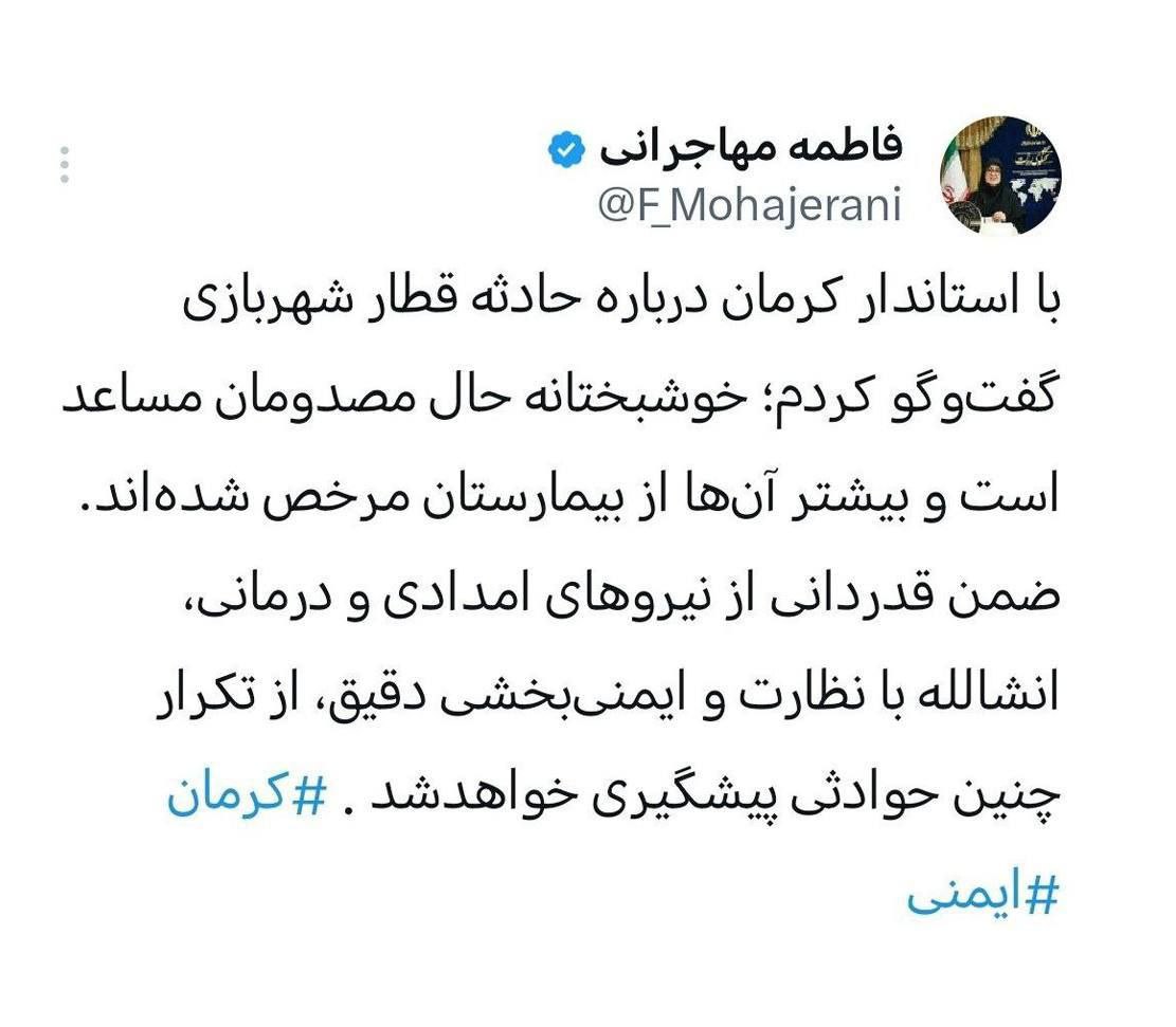 فاطمه مهاجرانی، سخنگوی دولت در صفحه شخصی خود نوشت: با استاندار کرمان درباره حادثه قطار شهربازی گفتوگو کردم، خوشبختانه حال مصدومان مساعد است و بیشتر آنها از بیمارستان مرخص شدهاند. ضمن قدردانی از نیروهای امدادی و درمانی، انشاءالله با نظارت و ایمنیبخشی دقیق، از تکرار چنین حوادثی پیشگیری خواهد شد.