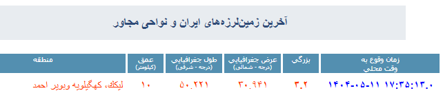 خبرگزاری دانشجو/ عصر امروز زمینلرزهای به بزرگی ۳.۲ ریشتر در عمق ۱۰ کیلومتری زمین، مناطق حوالی شهرهای لیکک و لنده در استان کهگیلویه و بویراحمد را تکان داد.