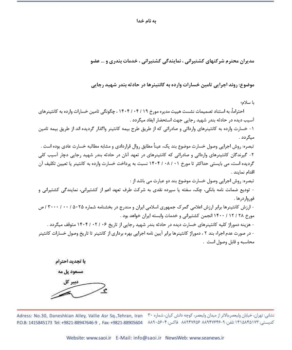 از گیرندگان کانتینرهای آسیبدیده خواسته شده که تا تاریخ ۱ شهریور ۱۴۰۴ نسبت به پرداخت خسارت یا تعیین تکلیف نهایی اقدامات لازم را انجام دهند.