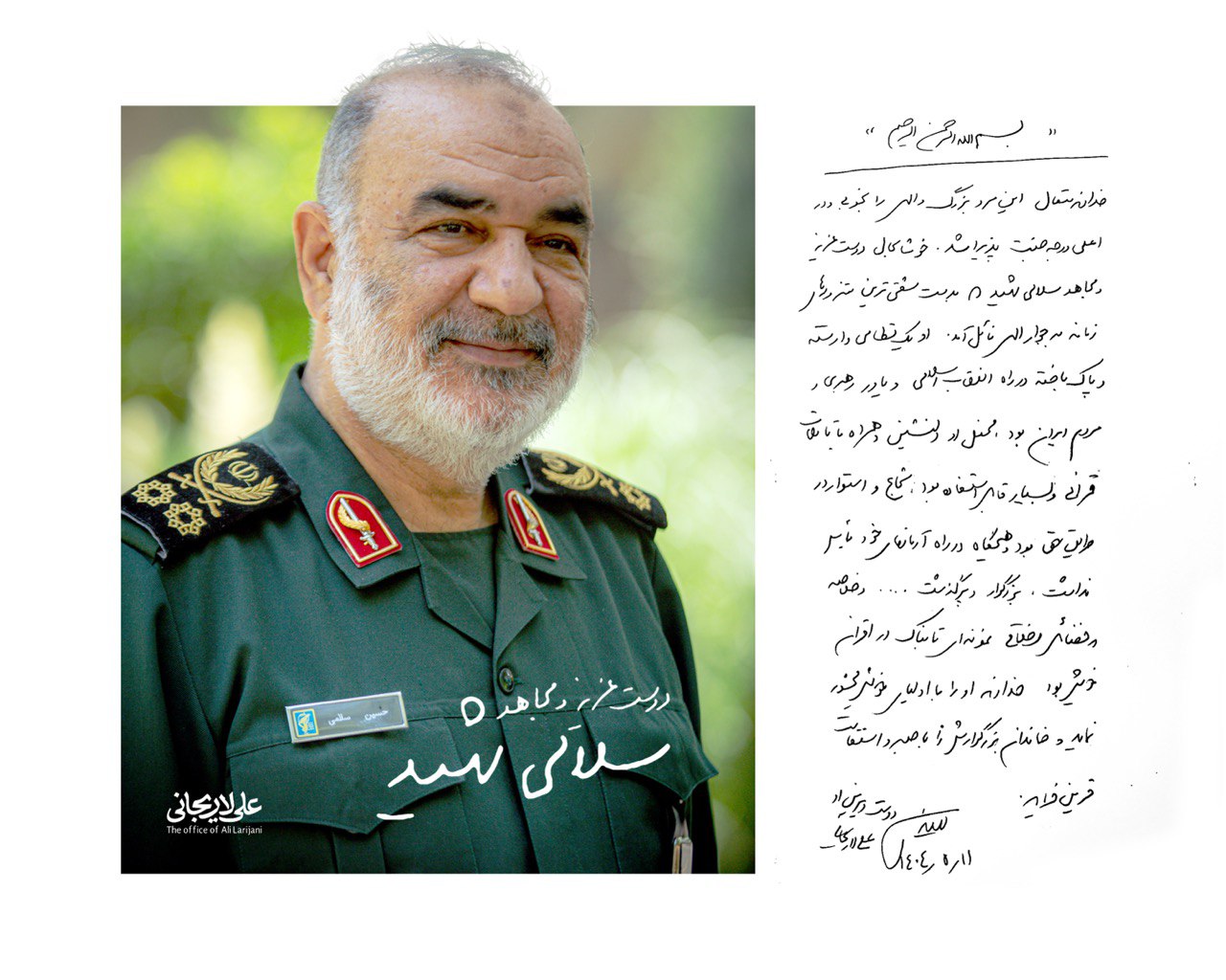علی لاریجانی مشاور رهبری انقلاب در این دیدار که شب گذشته انجام شد ضمن گفتوگو و تسلیت به خانواده فرمانده شهید سپاه پاسداران، در یادداشتی درباره وی نوشت: «خداوند متعال این مرد بزرگ و الهی را بخوبی و در اعلیدرجه جنت پذیرا شد. خوشابحال دوست عزیز و مجاهد سلامی شهید که بهدست شقیترین شرورهای زمانه به جوار الهی نائل آمد. او یک نظامی وارسته و پاکباخته در راه انقلاب اسلامی و یاور رهبری و مردم ایران بود. محفل او دلنشین و همراه با تلاوت قرآنی و بسیار قابلاستفاده بود. شجاع و استوار در طریق حق بود و هیچگاه در راه آرمانهای خود یأس نداشت، بزرگوار و پرگذشت... و خلاصه همه فضائل اخلاقی، نمونهای تابناک در اقران خویش بود. خداوند او را با اولیای خویش مشهور نماید و خاندان بزرگوارش را با صبر و استقامت قرین فرماید.»