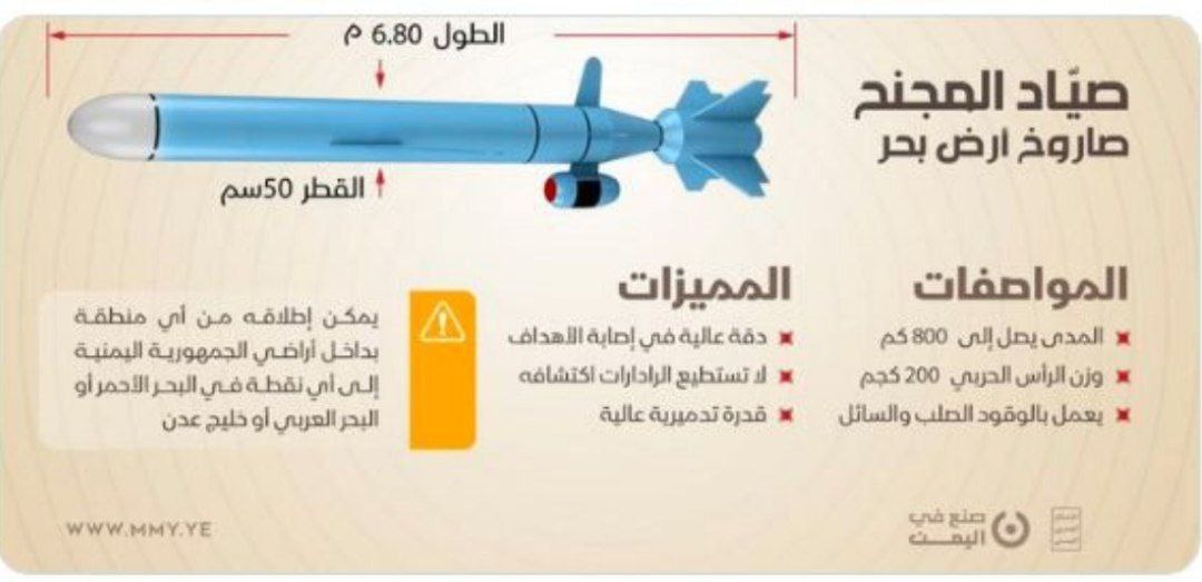 تسنیم/ نیروی دریایی یمن از موشک جدید «صیاد» با برد ۸۰۰ کیلومتر رونمایی و آن را به طور موفق آزمایش کرد.