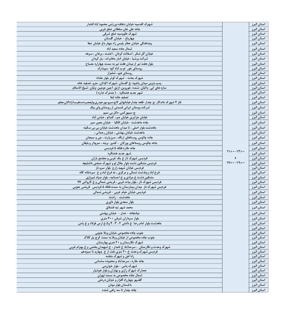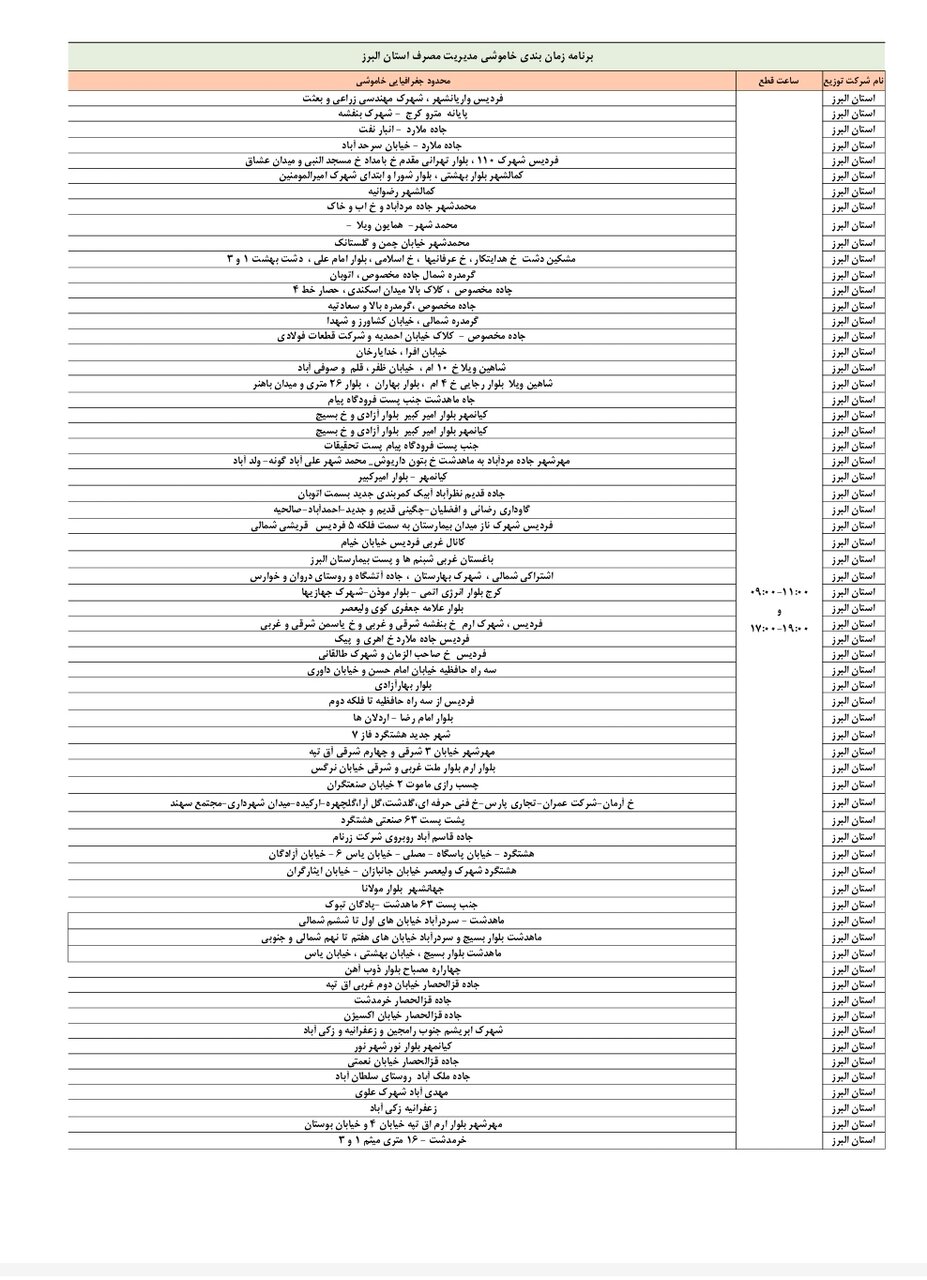 جدول قطعی برق استان البرز در ۱۴ مرداد