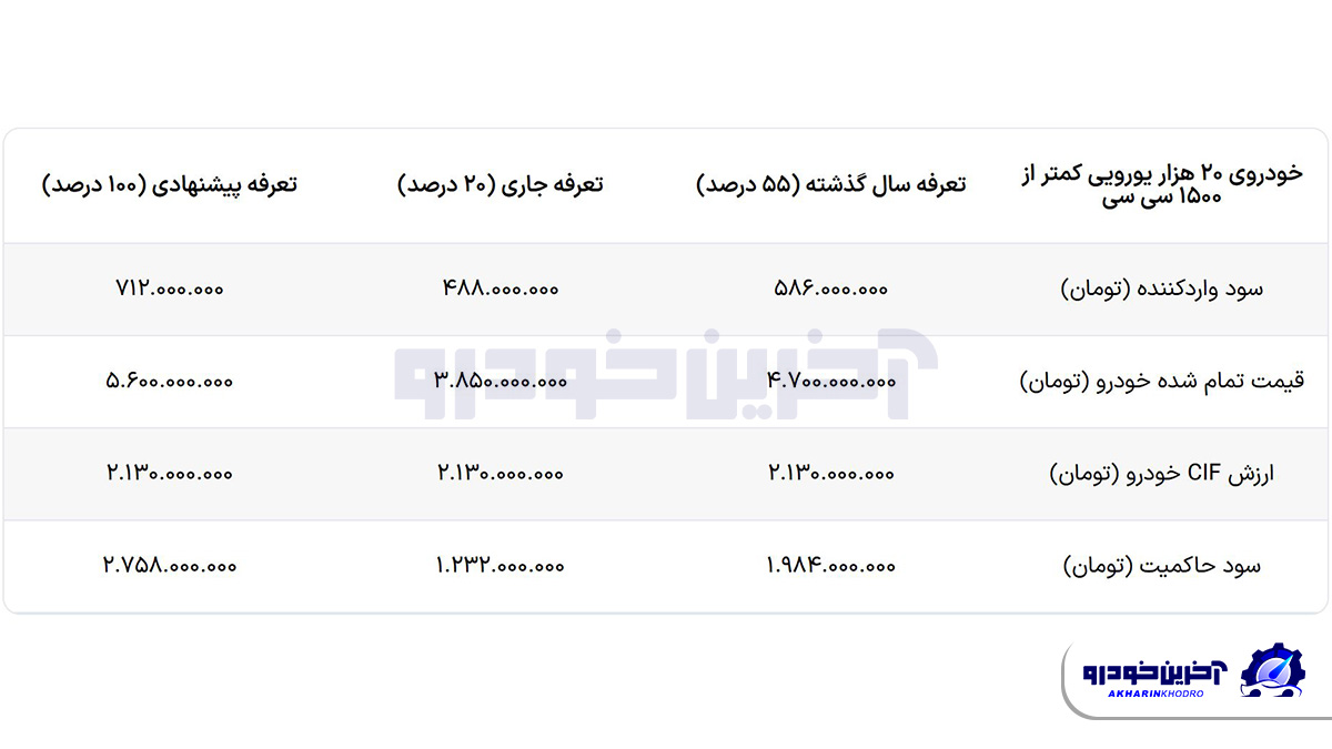 حال در جدول زیر برای یک خودروی کمتر از ۱۵۰۰ سی سی وارداتی ۲۰ هزار یورویی، قیمت نهایی خودرو و سود واردکننده بر اساس سه تعرفه محاسبه شده است. لازم به ذکر است که قیمت این خودروها به صورت حدودی محاسبه شده است. با توجه اینکه ارزش دریافتی واردکننده به ازای هر یورو در اواخر سال گذشته، ۹۵ تا ۱۰۵ هزار تومان (۵درصد زیر قیمت بازار) بوده است، عدد ۱۰۰ هزار تومان برای هر یورو لحاظ شده و همچنین عدد مبنای دریافت عوارض به ازای هر یورو توسط قانون گذار ۷۲ هزار تومان تعیین گردیده است.