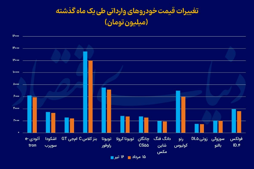 برای بررسی بازار خودروهای وارداتی، بهای ۱۲محصول خارجی را از ۱۶تیرماه تا روز گذشته زیر ذرهبین قرار داده ایم، این خودروها در بازه زمانی مورد بررسی به طور میانگین ۳۴۰میلیون تومان معادل ۵.۶درصد افت قیمت را تجربه کردهاند.