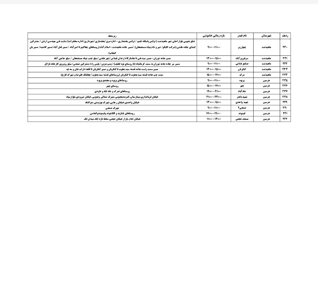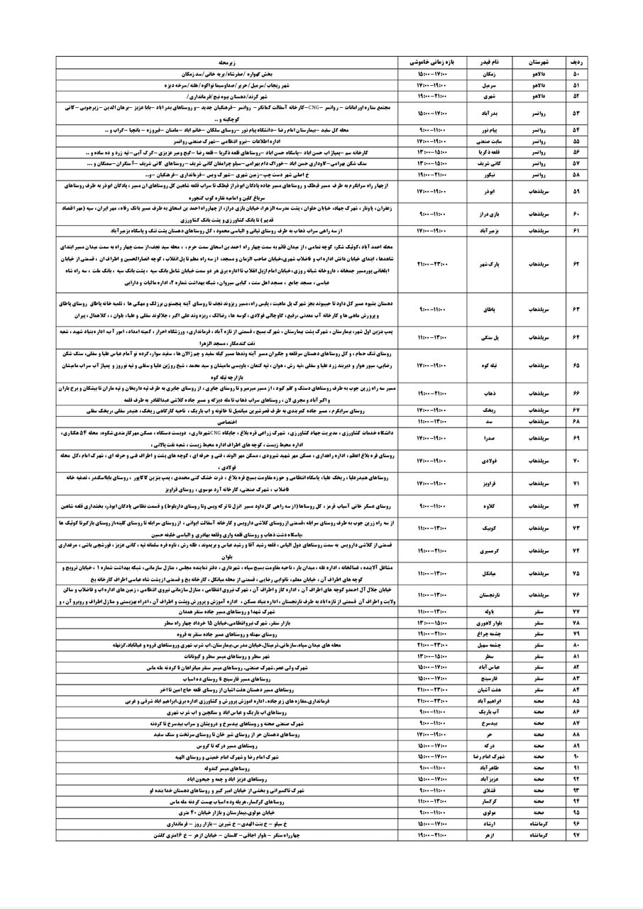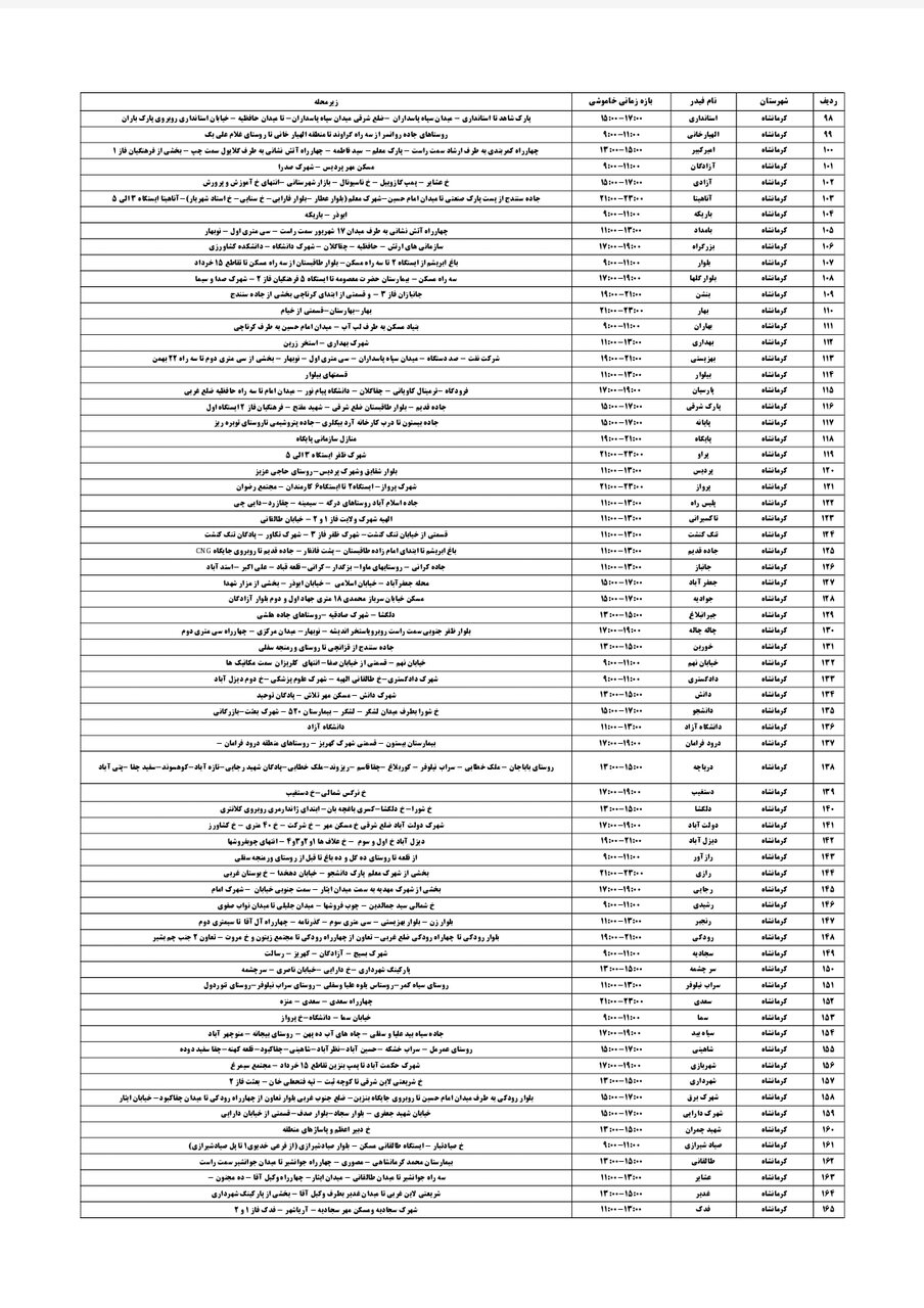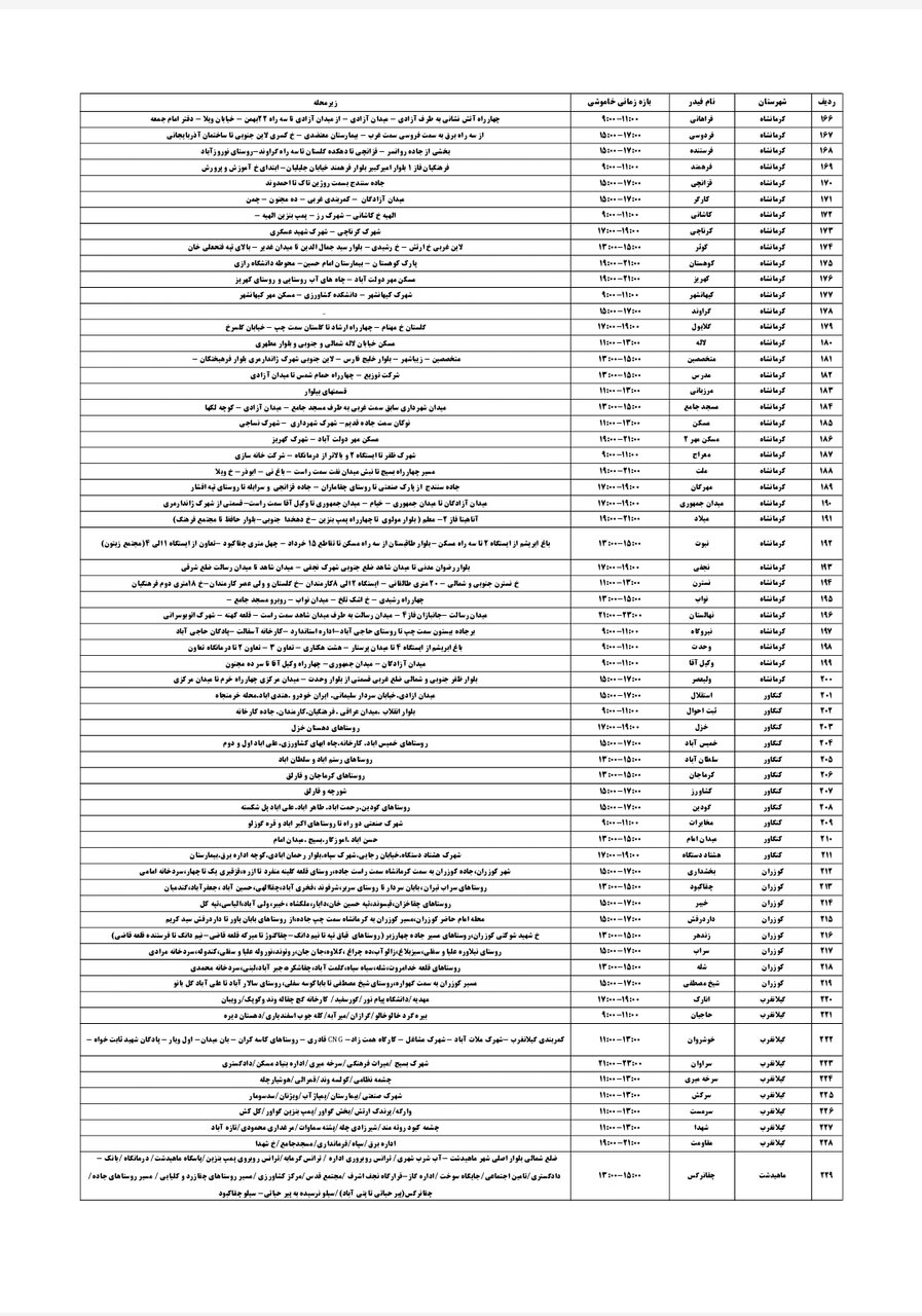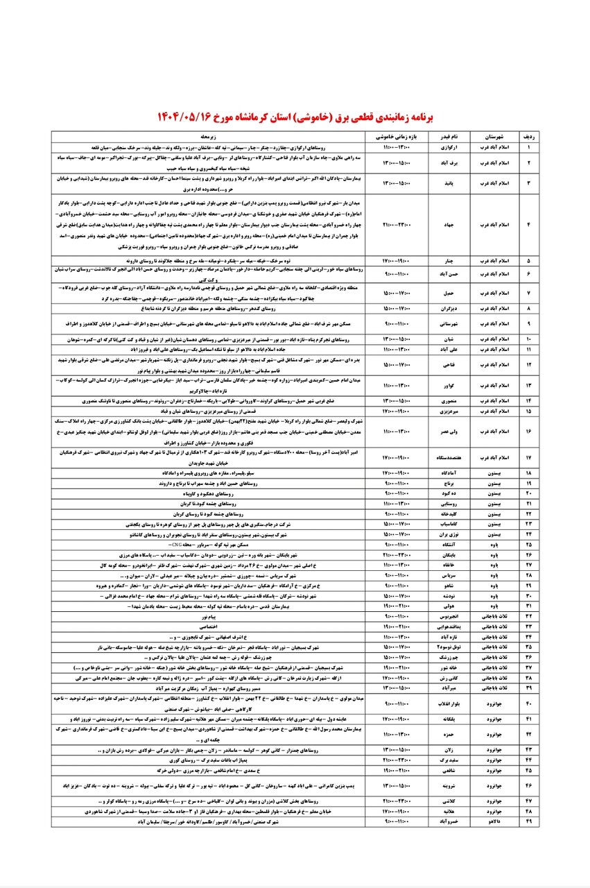 شرکت توزیع برق استان کرمانشاه طی جدولی، زمانبندی قطعی برق در مناطق مختلف استان کرمانشاه را برای فردا _پنجشنبه شانزدهم مرداد_ اعلام کرد.