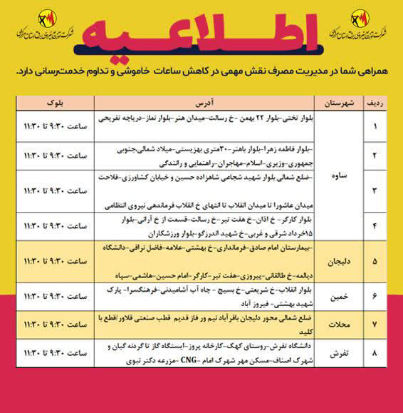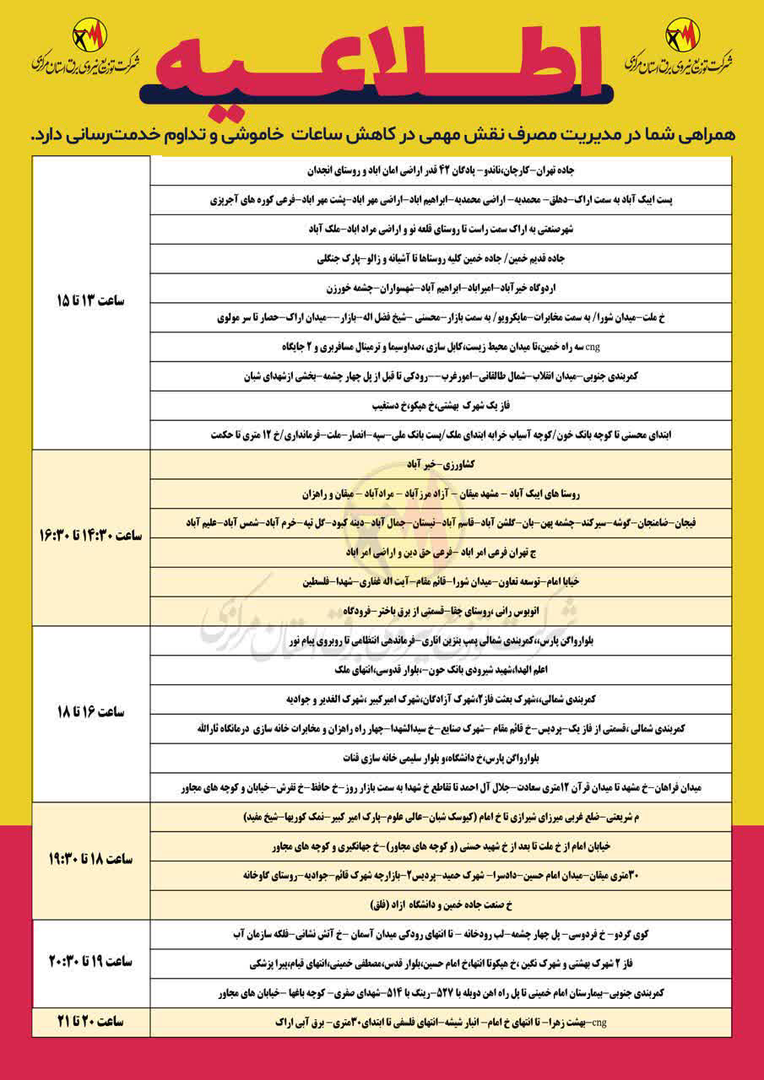 فارس/ شرکت توزیع برق استان مرکزی جدول خاموشیهای برق خانگی را منتشر کرد.