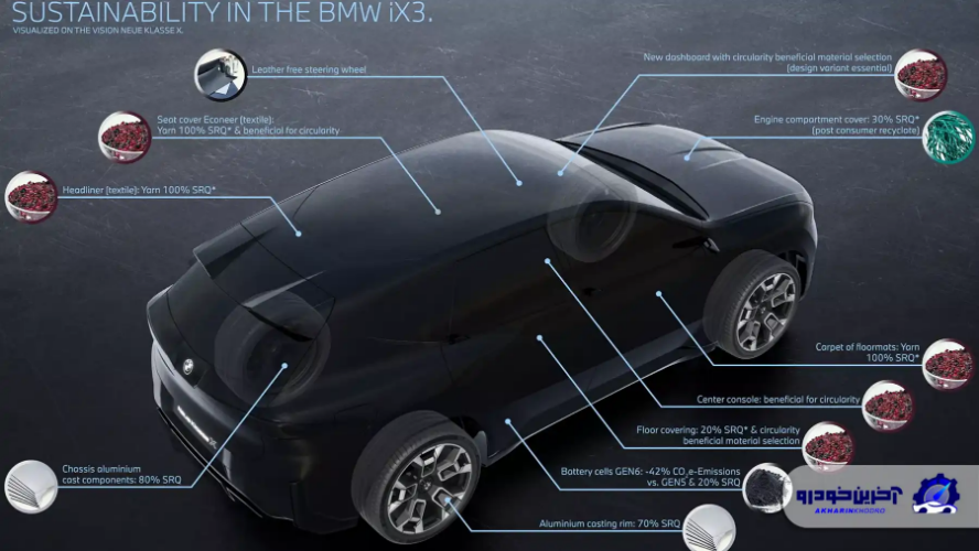 یکی از جالبترین نکات فاش شده درباره iX3 این است که حدود ۳۳ درصد از قطعات این خودرو از مواد بازیافتی ساخته شدهاند. ب ام و این فرایند را «طراحی برای چرخه پذیری» نامیده؛ به این معنا که در تمام مراحل تولید، از مواد ثانویه و قابل بازیافت استفاده شده است.