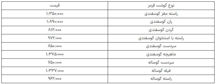 جدول زیر قیمت دام زنده را بهازای هر کیلوگرم در فروشگاههای سطح شهر نشان میدهد.