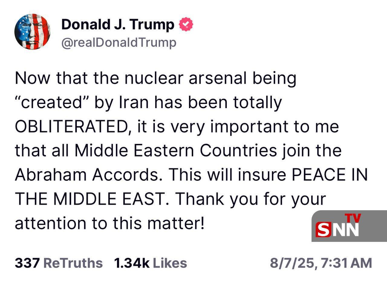 دونالد ترامپ رییس جمهور آمریکا در شبکه اجتماعی تروث سوشال متعلق به خود مدعی شد: «اکنون که زرادخانه هستهایای که توسط ایران "در حال ساخته شدن" بود، بهطور کامل نابود شده است، برای من بسیار اهمیت دارد که تمامی کشورهای خاورمیانه به توافق ابراهیم بپیوندند. این کار صلح در خاورمیانه را تضمین خواهد کرد.»