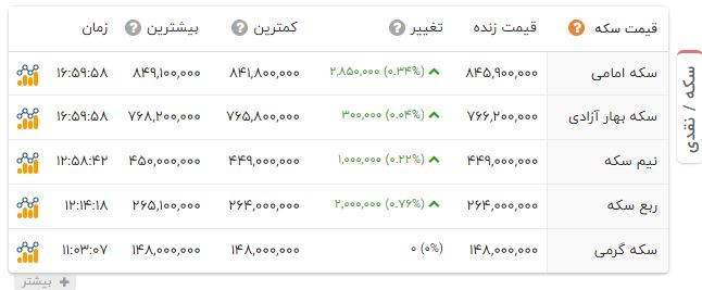 به گزارش آخرین خبر و تا لحظه تنظیم این خبر، سکه امامی با افزایش 285 هزار تومان، 84 میلیون و 590 هزار تومان قیمتگذاری شد.