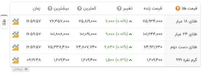 طلای 24 عیار نیز شاهد 9 هزار تومان افزایش قیمت بود و 10 میلیون و 124 هزار و 400 تومان قیمت گرفت.