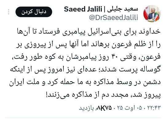 «خداوند برای قوم بنیاسراییل پیامبری فرستاد تا آنها را از ظلم فرعون برهاند اما آنها پس از پیروزی بر فرعون وقتی 40 روز پیامبرشان به کوه طور رفت گوسالهپرست شدند. عدهای نیز امروز پس از این که دشمن در وسط مذاکره به ما حمله کرد و ملت ایران پیروز شد مجدد [ مجدداً ] دم از مذاکره میزنند!»