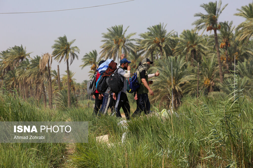 ایسنا/ برخی از زائران اربعین حسینی پس از طی مسیر از جنوبی ترین مناطق عراق و عبور از شهر دیوانیه، برای رفتن به سمت مسجد کوفه و پس از آن کربلا، از نخلستان‌های منطقه شامیه عبور می‌کنند.