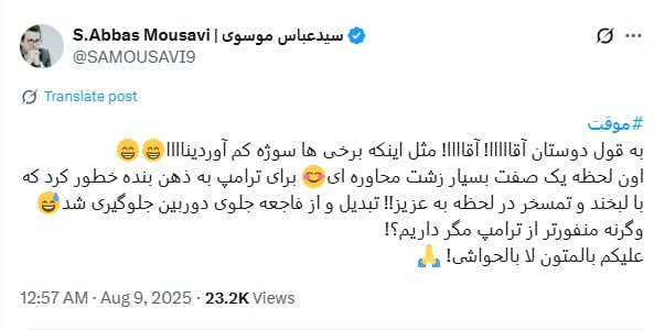 سید عباس موسوی در این برنامه گفت: این که آقای ترامپ عزیز به بحث آذربایجان و ارمنستان وارد شده جالب و بودار است...