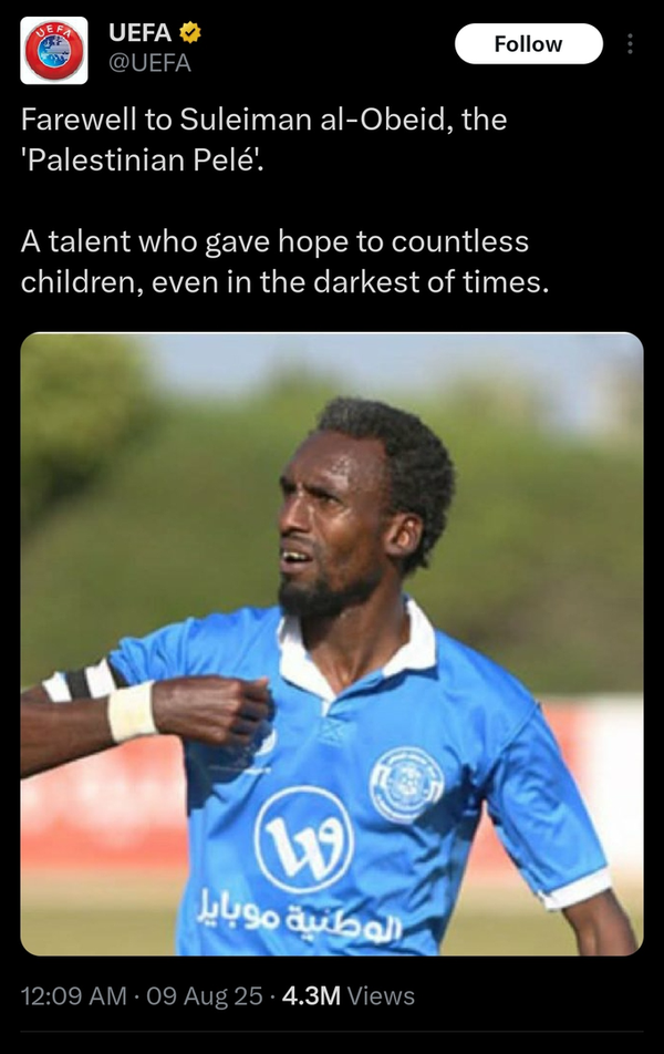 اتحادیه فوتبال اروپا که کشتار فوتبالیستهای فلسطینی در دو سال اخیر توسط ارتش اسرائیل را نادیده میگرفت امروز(شنبه) با انتشار پستی کوتاه در ایکس بدون هیچ اشاره به کشته شدن سلیمان العبید، نوشت: وداع با سلیمان العبید، «پله فلسطینی».استعدادی که حتی در تاریکترین دوران، به کودکان بیشماری امید بخشید.یوفا پیش از این حتی یکبارهم درباره کشته شدن بیش از ۵۰۰ فوتبالیست فلسطینی توسط رژیم صهیونیستی واکنش نشان نداده است.