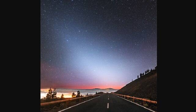 نور عجیب پایین جاده در این عکس، غباری است که به دور خورشید میچرخد. در زمانهای مشخصی از سال، نواری از غبار منعکسکننده نور خورشید از منظومه شمسی داخلی، درست پس از غروب خورشید یا درست پیش از طلوع خورشید به طور برجستهای ظاهر میشود. این نوار نورانی، «نور منطقهالبروج» یا «صبح کاذب»(Zodiacal light) نامیده میشود.