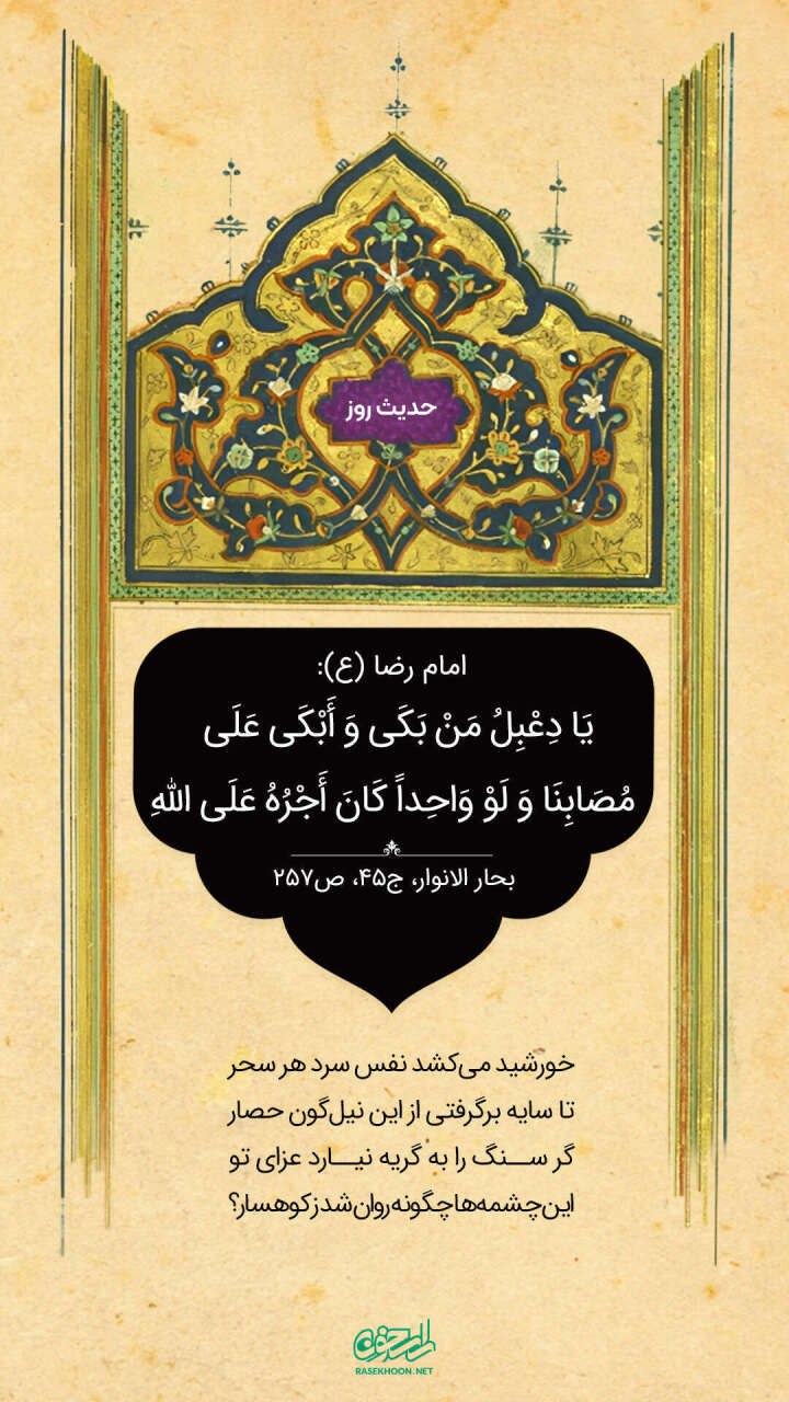ای دعبل! هر کس بر مصیبت جدم حسین علیهالسلام بگرید، خداوند گناهان او را به طور کامل میآمرزد.